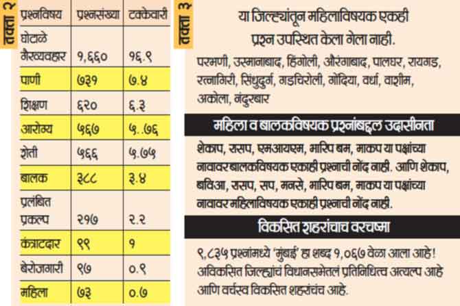 आम्ही २०१४ ते २०१८ या काळातल्या महाराष्ट्र विधानसभेतील १३ अधिवेशनांत उपस्थित केल्या गेलेल्या प्रश्नांचा अभ्यास केला. हे कामकाजाचे दिवस १९८ आहेत. प्रश्नोत्तरांच्या तासातले तारांकित प्रश्न, महत्त्वाच्या प्रासंगिक विषयांवरच्या लक्षवेधी सूचना आणि कळीच्या मुद्दय़ांवर केल्या जाणाऱ्या अर्धा तास चर्चा हे सगळं मिळून एकूण ९,८३५ प्रश्न आमच्या हाती लागले. आमदारांच्या नावांचा प्रथमोल्लेख असलेले हे सगळे प्रश्न. आम्ही प्रत्येक प्रश्न वाचून, तपासून विषयवार वर्गीकरण केलं. प्रश्नसंख्येची स्पर्धा लावण्यापेक्षा मानवविकासाच्या विषयांना महत्त्व दिलं. माविनि कमी असलेल्या नऊ जिल्ह्यांकडे अधिक लक्ष दिलं. (तक्ता १) यात, गडचिरोली आणि वाशीम हे विदर्भातले दोन, नंदुरबार, धुळे हे खानदेशातले दोन आणि उस्मानाबाद, लातूर, हिंगोली, नांदेड व जालना हे मराठवाडय़ातले पाच जिल्हे आहेत. या नऊ जिल्ह्यांची मिळून प्रश्नसंख्या (१,१२३) ही मुंबई, मुंबई उपनगर आणि ठाणे या तीन जिल्ह्यंच्या एकत्रित प्रश्नसंख्येच्या (२,१३७) जवळपास निम्मी आहे. अवघा एक प्रश्न नंदुरबार या सर्वात कमी माविनि असलेल्या जिल्ह्यतून विचारला गेला. मुंबई उपनगर या एका जिल्ह्यतून मांडले गेलेले प्रश्न सर्वाधिक १,००३ – म्हणजे ११ टक्क्यांच्यावर आहेत. तर नंदुरबार आणि गडचिरोली या राज्यातल्या सर्वात तळातल्या जिल्ह्यंची एकत्रित प्रश्नसंख्या एक टक्कादेखील नाही. या ९,८३५ प्रश्नांमध्ये ‘मुंबई’ हा शब्द १,०६७ वेळा आला आहे! अविकसित जिल्ह्यंचं विधानसभेतलं प्रतिनिधित्व असं अत्यल्प आहे आणि वर्चस्व विकसित शहरांचंच आहे.