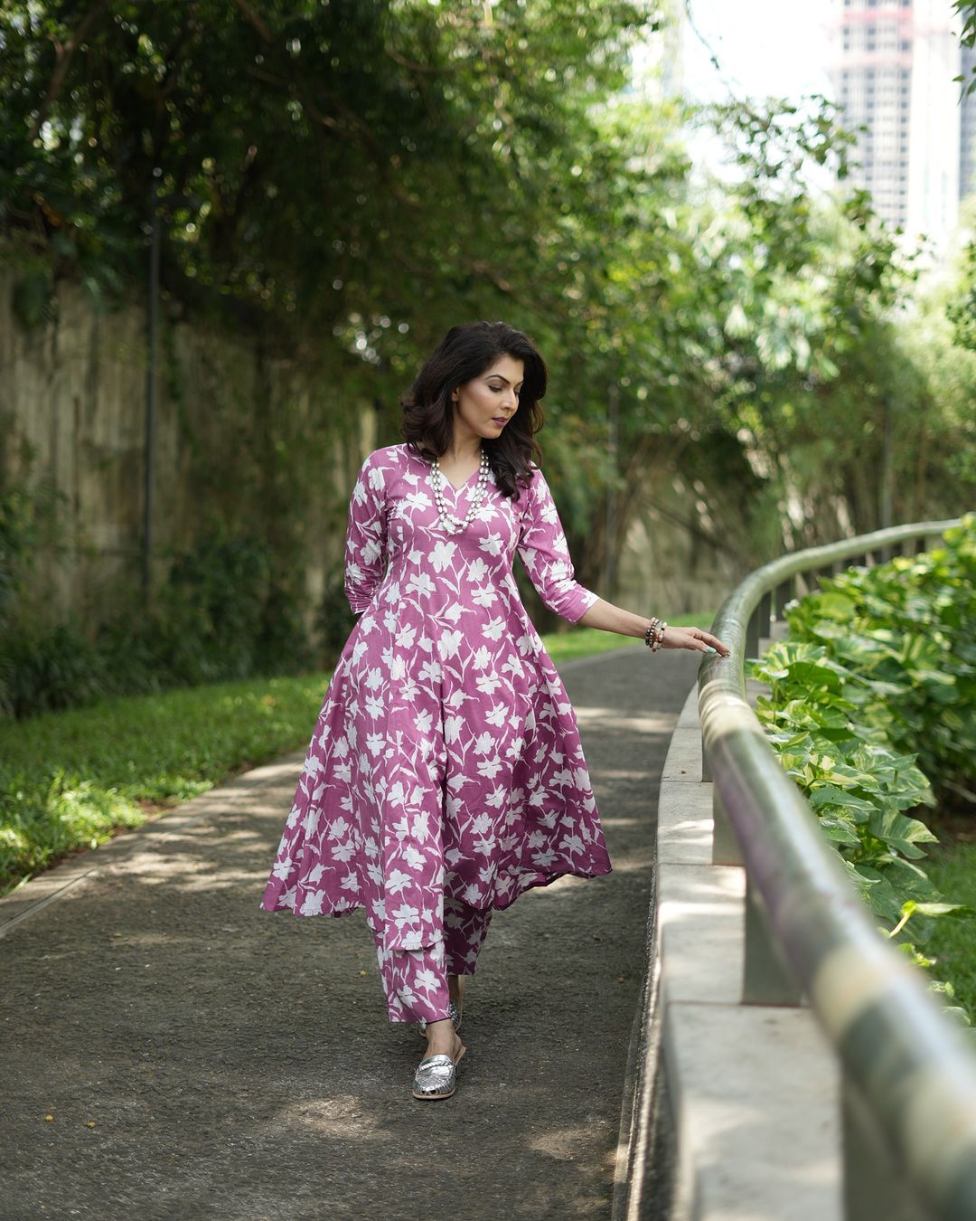 फोटोशूटसाठी गुलाबी रंगाचा फ्लोरल प्रिंटेड ड्रेस परिधान