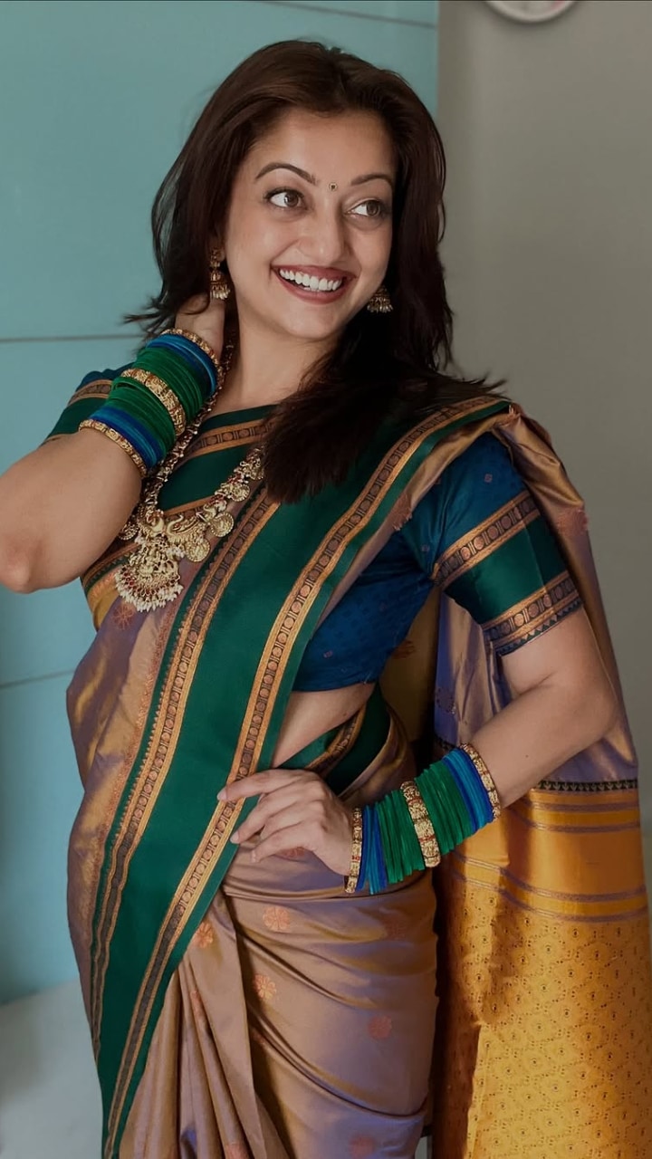 सोनेरी रंगाच्या धुपछाव नारायण पेठ साडीतील लूक
