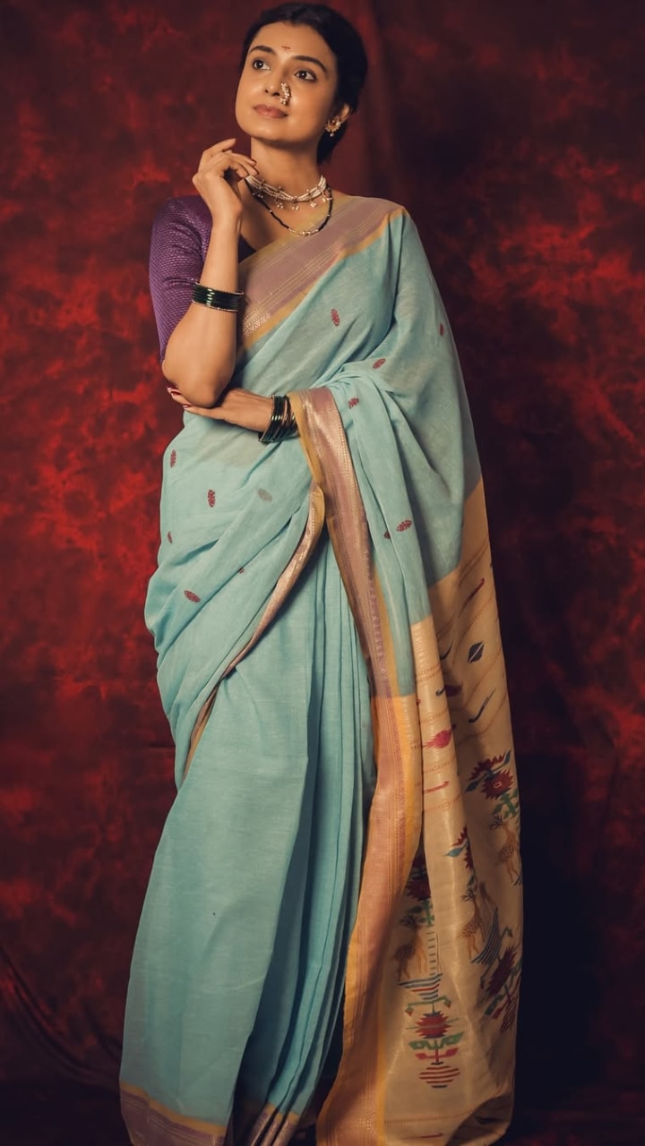 फिकट रंगाच्या मल कॉटन पैठणी साडीतील लूक