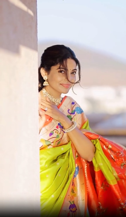 पोपटी रंगाच्या पैठणी साडीतील खास लूक