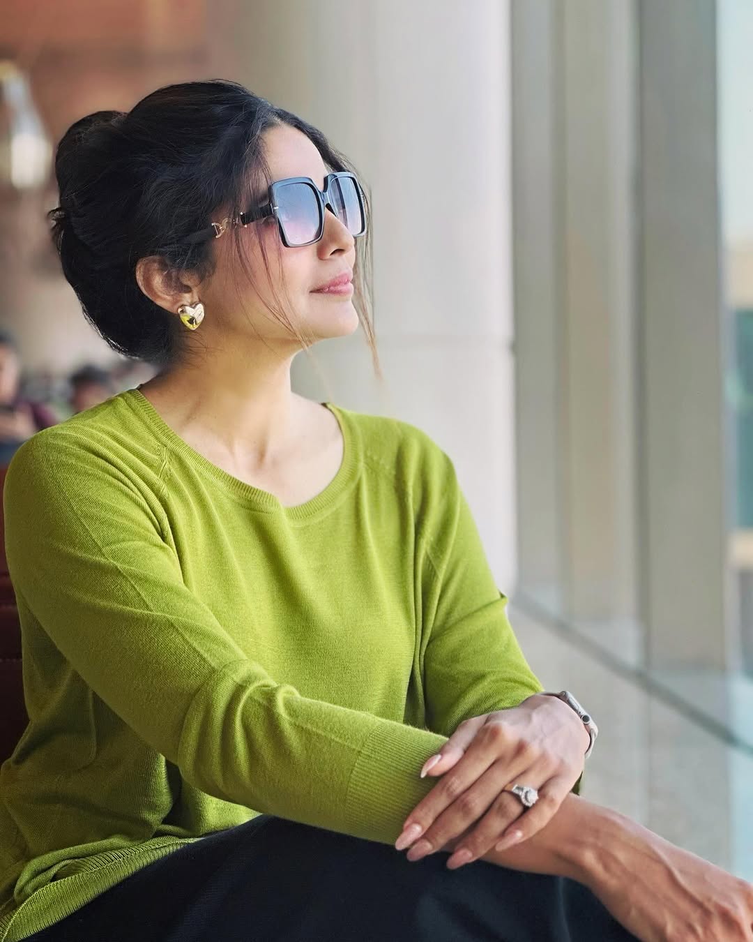 या फोटोंमध्ये हिरव्या रंगाचा टॉप आणि काळी पॅण्ट परिधान