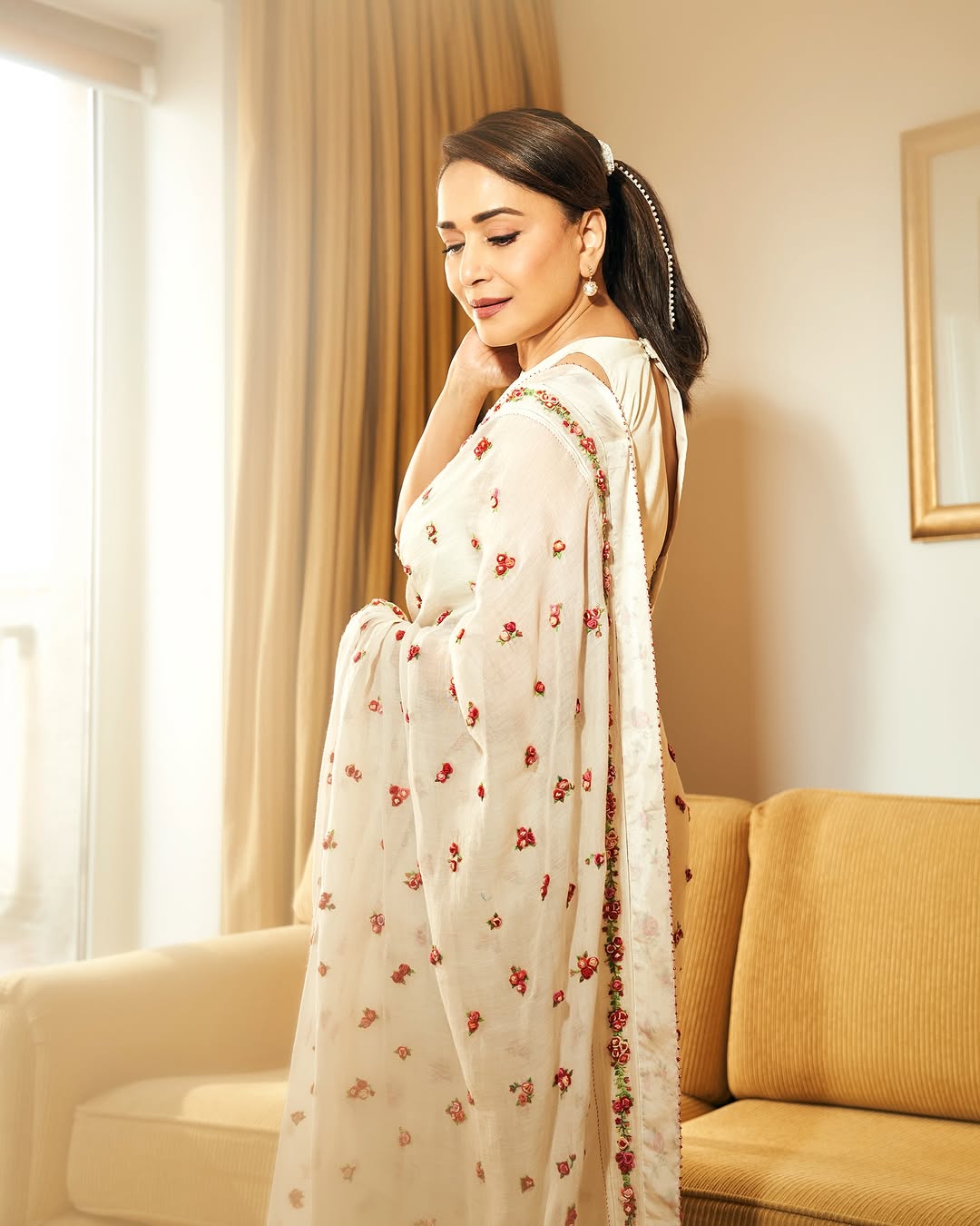 पांढऱ्या रंगाच्या फ्लोरल एम्ब्रॉयडरी साडीतील लूक