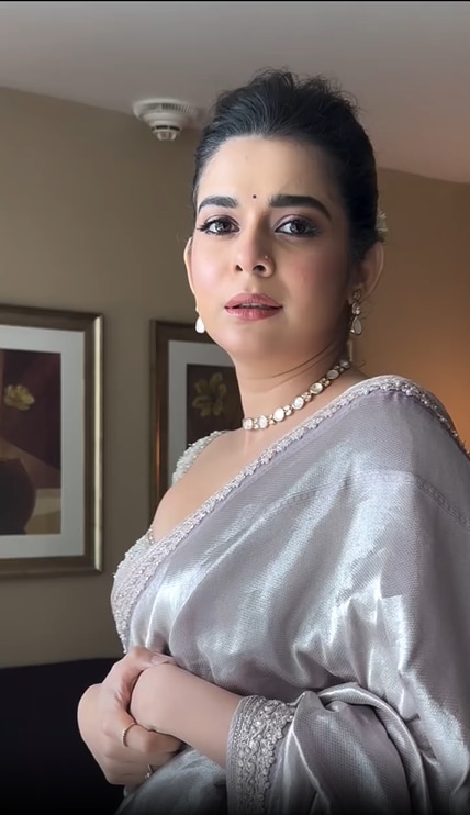 चंदेरी रंगाच्या प्लेन साडीतील खास लूक