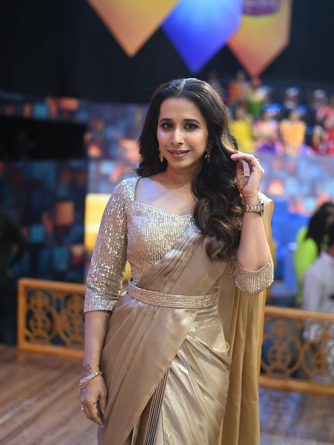 साडीतील लूकवर परिधान केला सोनेरी शिमरी ब्लाऊज