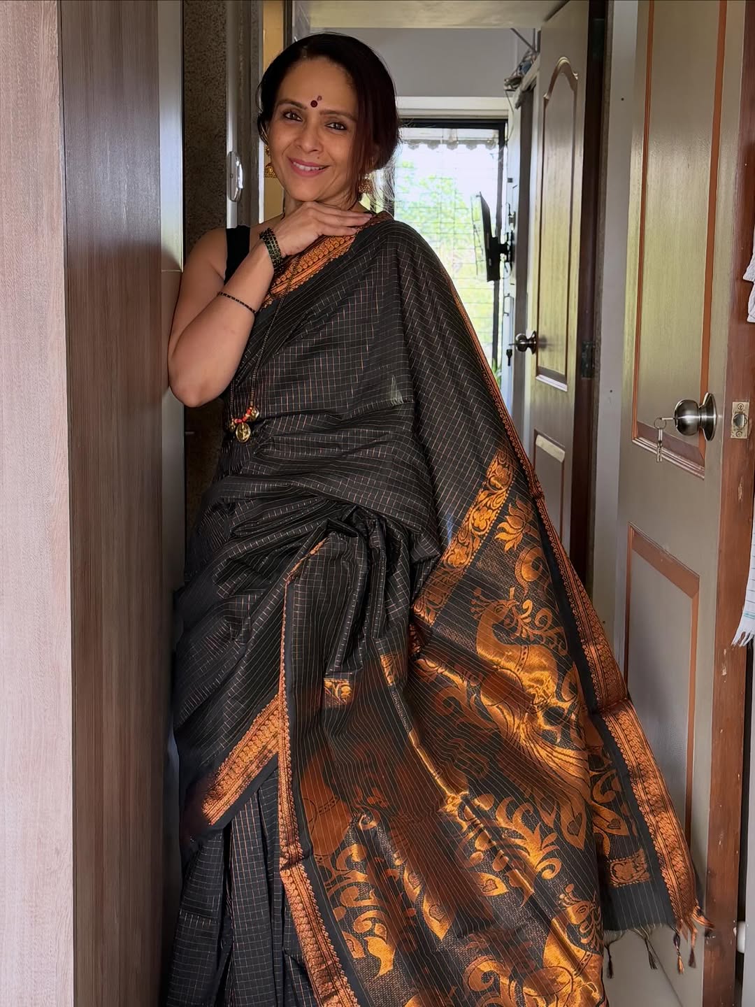 काळ्या रंगाच्या भरजरी साडीत ऐश्वर्या नारकर यांचा अत्यंत मोहक अंदाज दिसून येत आहे.