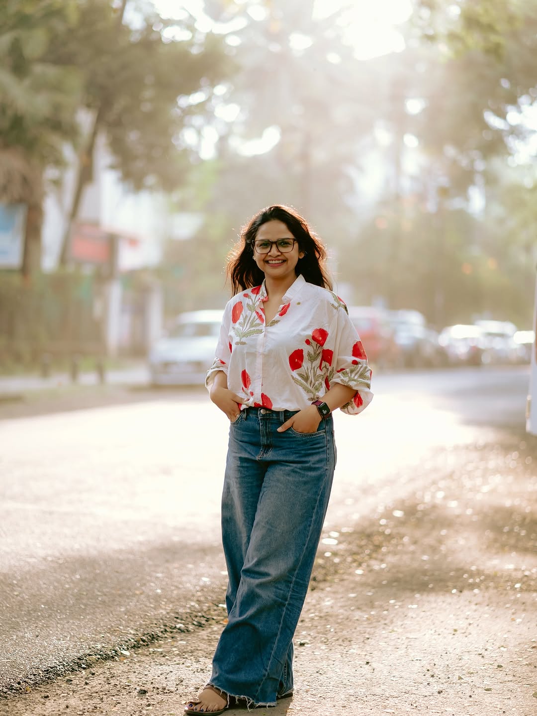 पांढऱ्या रंगाचा रंगीबेरंगी हत्ती प्रिंट असलेला ड्रेस, हलकं स्मित आणि मोकळे केस