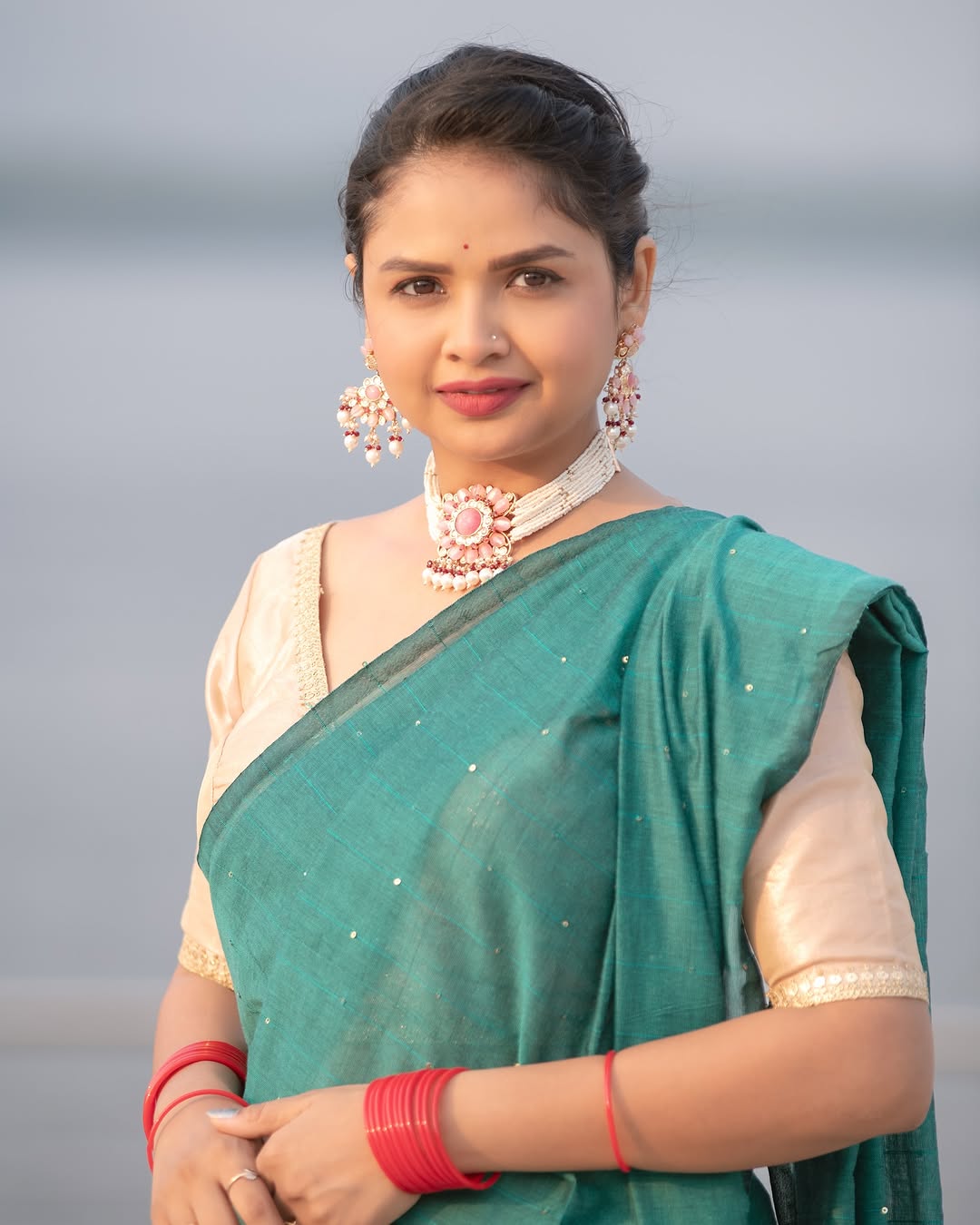 फोटोशूटसाठी नेसली राखाडी रंगाची कॉटन साडी