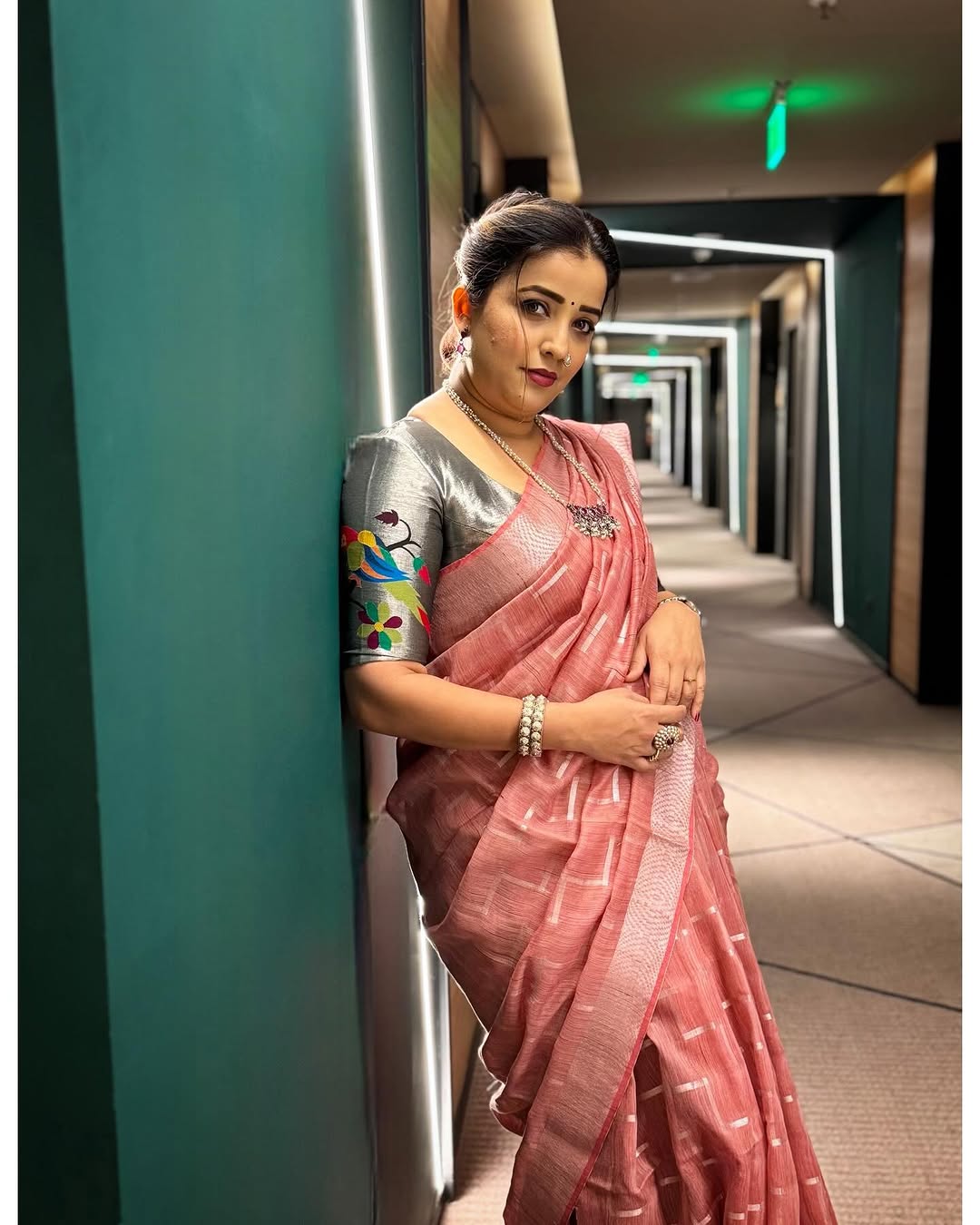 हलक्या लाल रंगाची कांजीवरम साडी व आकर्षक ब्लाऊज