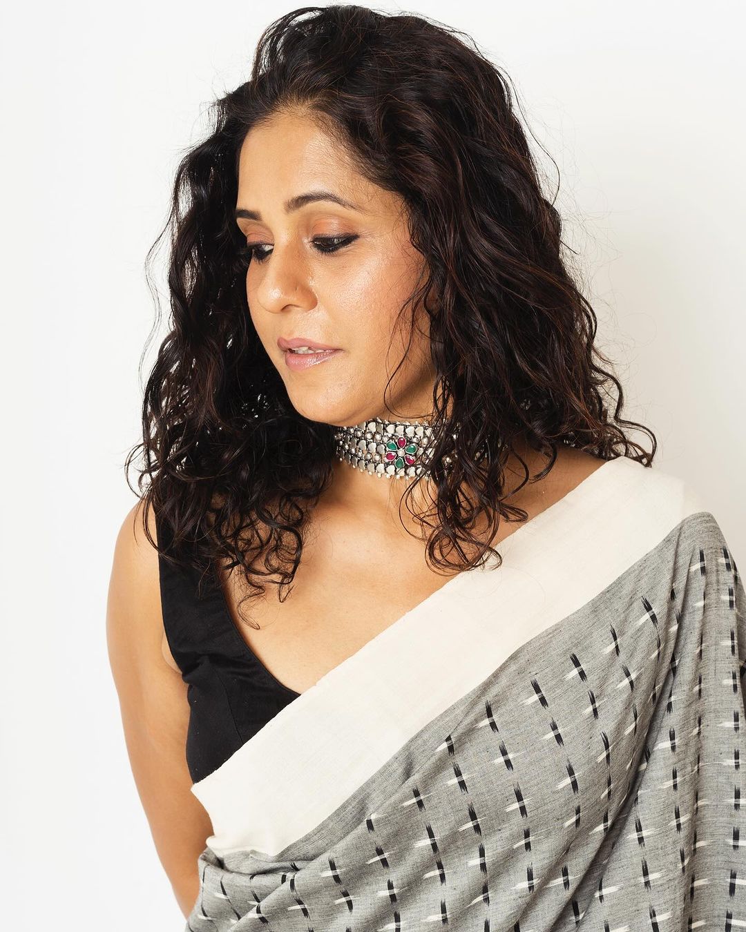 पांढऱ्या आणि राखाडी रंगाच्या साडीतील सुंदर लूक