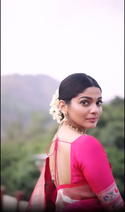 गुलाबी रंगाच्या पैठणी साडीतील सुंदर लूक