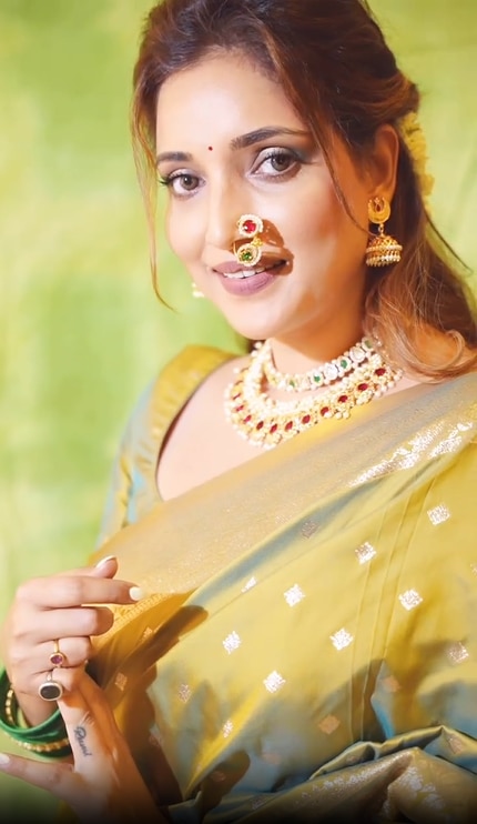 शेवाळी रंगाच्या सिल्क साडीतील सुंदर लूक