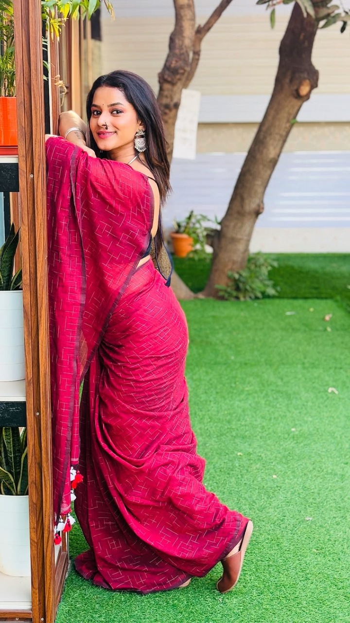 गडद लाल रंगाच्या कॉटन साडीतील लूक