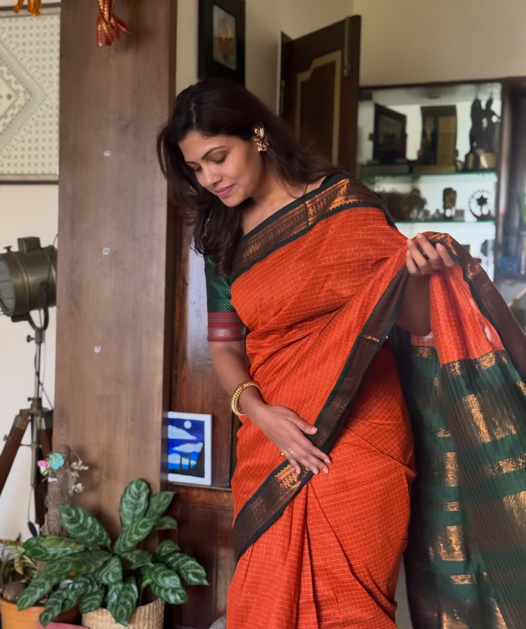 साडीच्या काठावर असलेले पारंपरिक नक्षीकाम जुन्या काळातील आठवणींना उजाळा देणारा ठरत आहे.