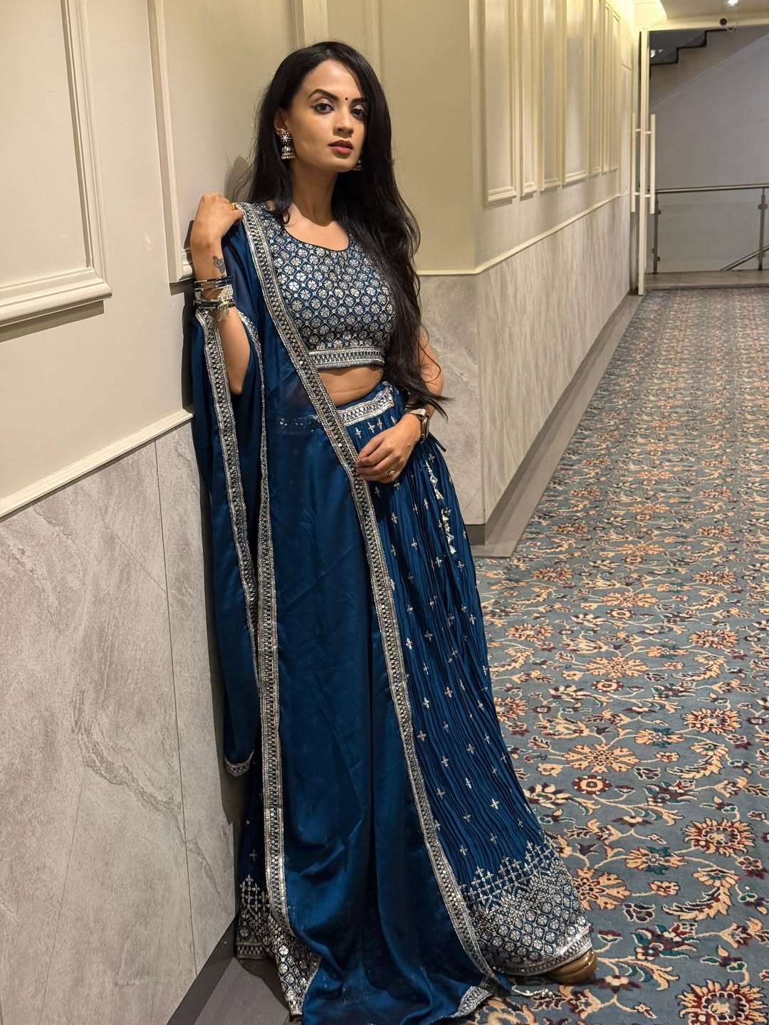 निळ्या रंगाच्या डिझायनर लेहेंग्यात तिचे सौंदर्य अधिकच खुलून दिसत आहे
