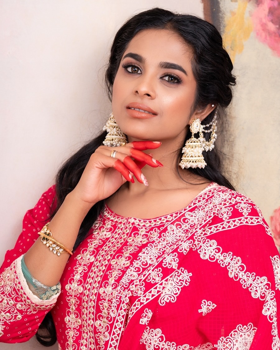 लाल रंगाचा डिझायनर ड्रेस परिधान