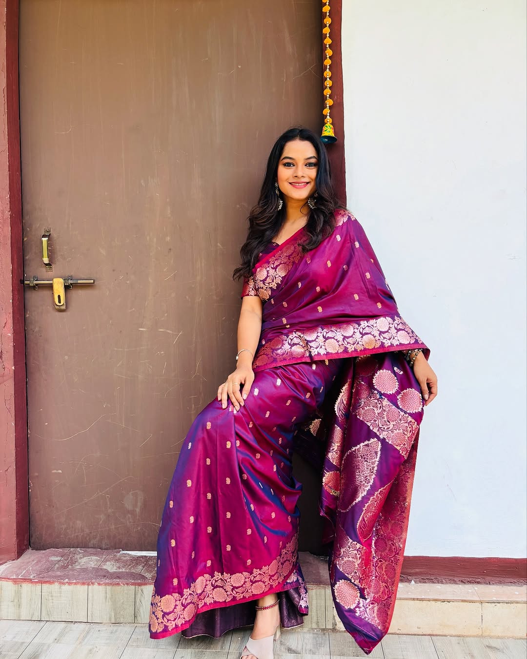 जांभळ्या रंगाच्या साडीत खुललं साक्षीचं सौंदर्य