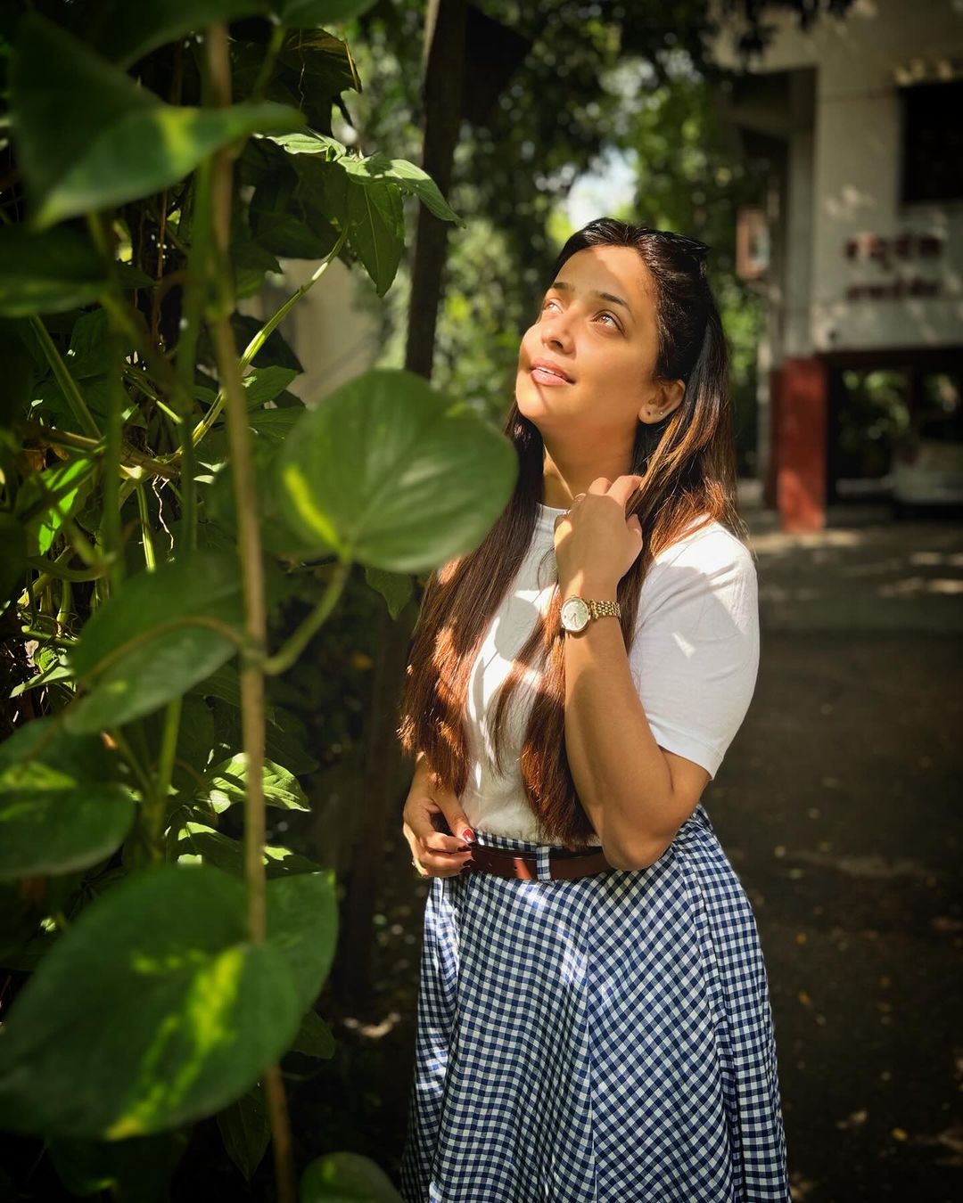 पांढऱ्या रंगाचा टॉप आणि निळ्या रंगाचा चेक्स स्कर्ट परिधान