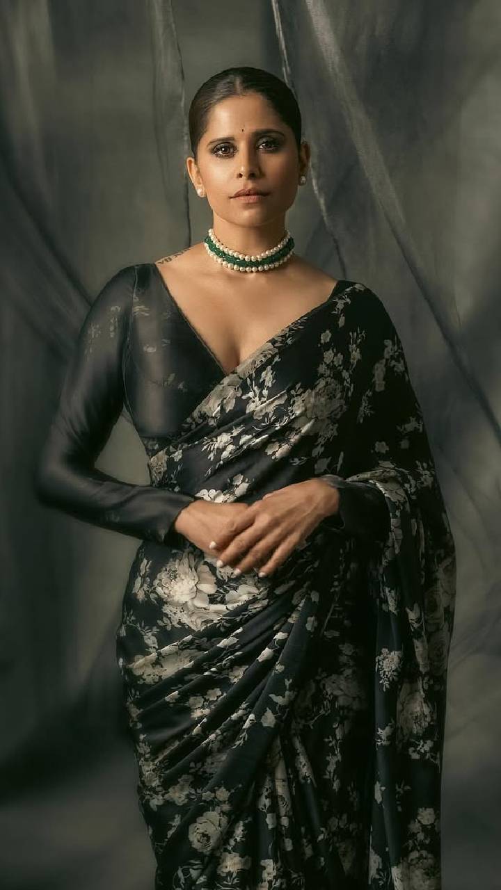 सिनेमाच्या प्रमोशनसाठी केलेल्या लूकमध्ये काळ्या रंगाची प्रिंटेड साडी परिधान केली