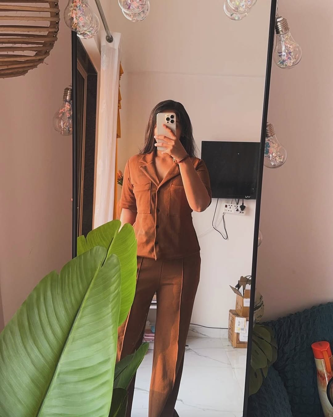तपकिरी रंगाच्या को-ऑर्ड सेटमधील लूक