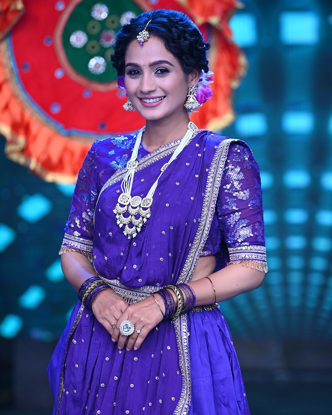 गणेशोत्सवासाठी जांभळ्या रंगाची नऊवारी साडी परिधान