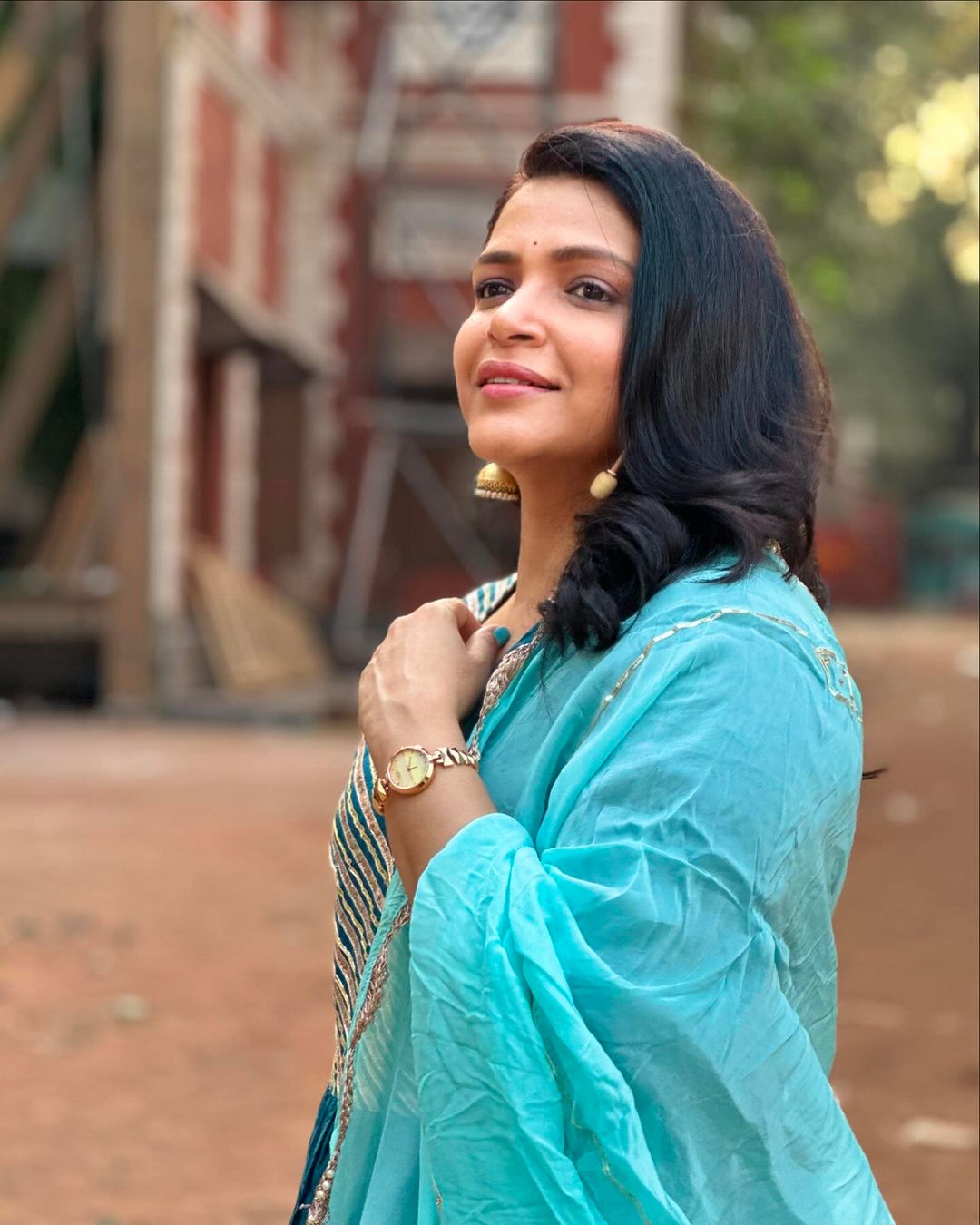 निळ्या रंगाचा सुंदर अनारकली ड्रेस परिधान