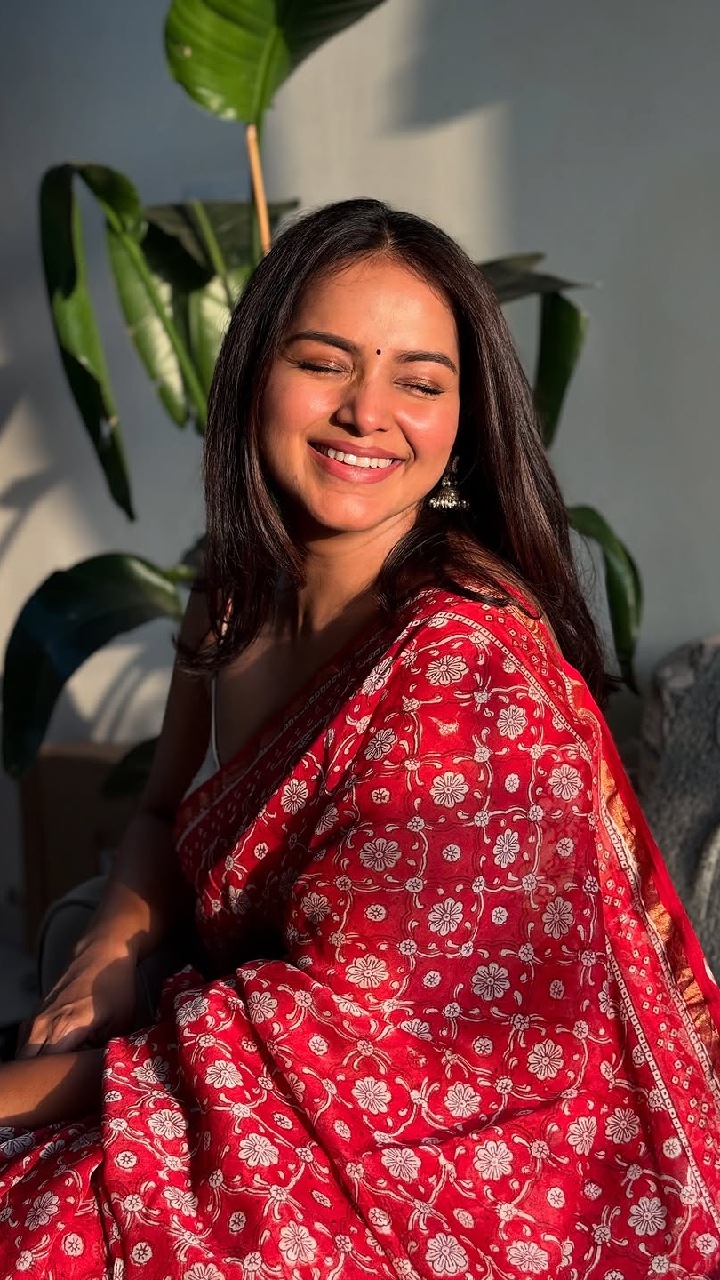 लाल रंगाच्या प्रिंटेड साडीतील खास लूक