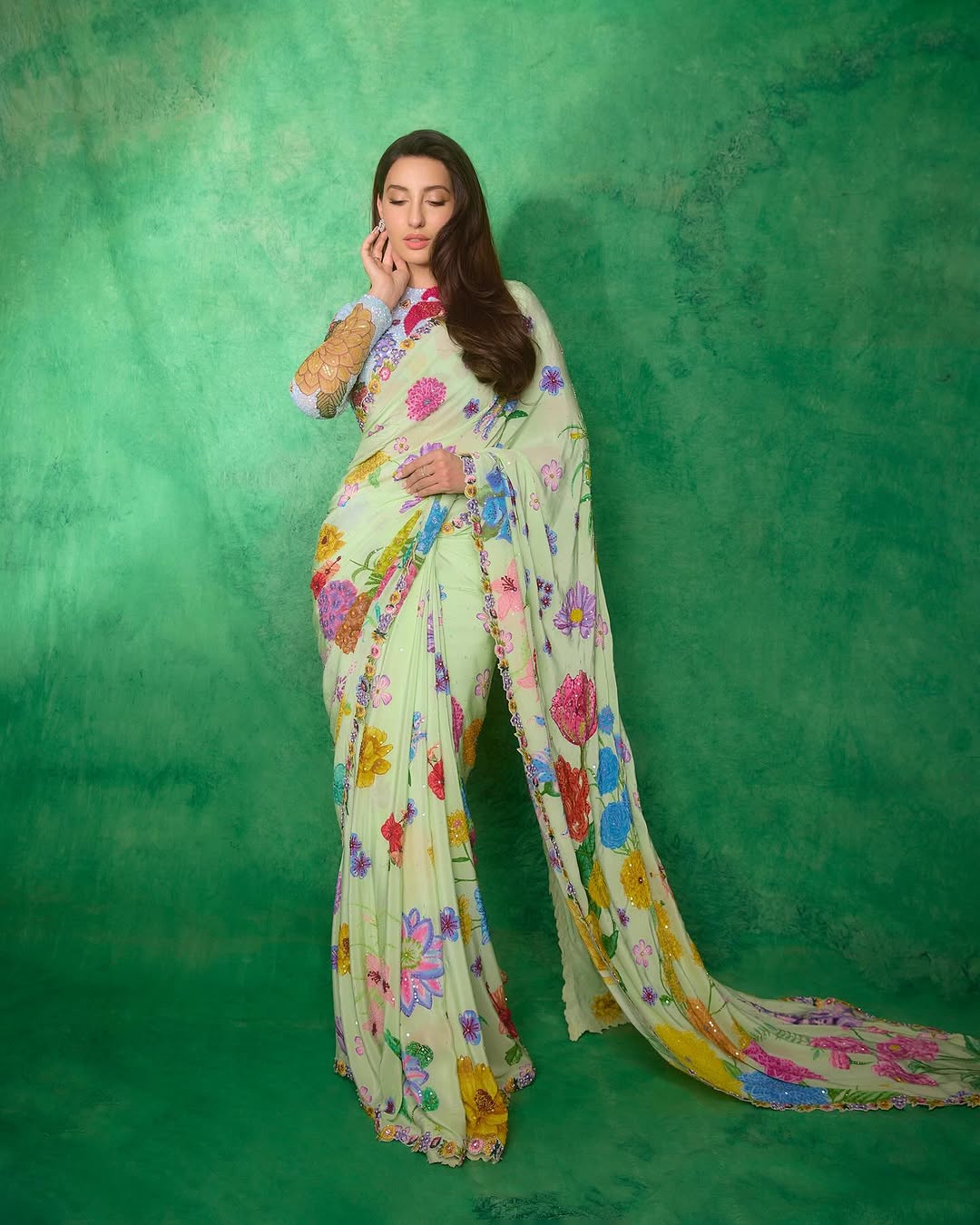 पेस्टल हिरव्या रंगाच्या फ्लोरल प्रिंट साडीतील खास लूक