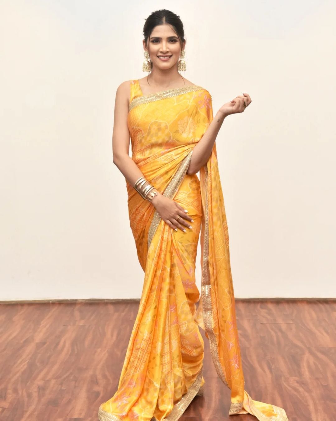 पिवळ्या प्रिंटेड साडीत खास फोटोशूट