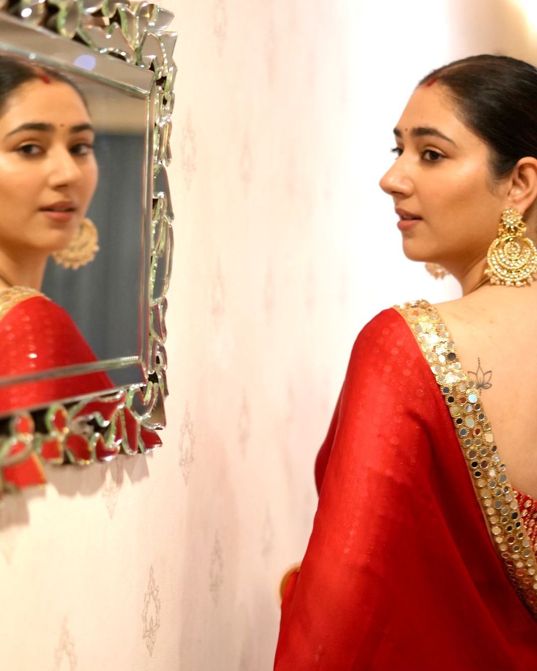 लाल रंगाच्या प्लेन साडीतील सुंदर लूक