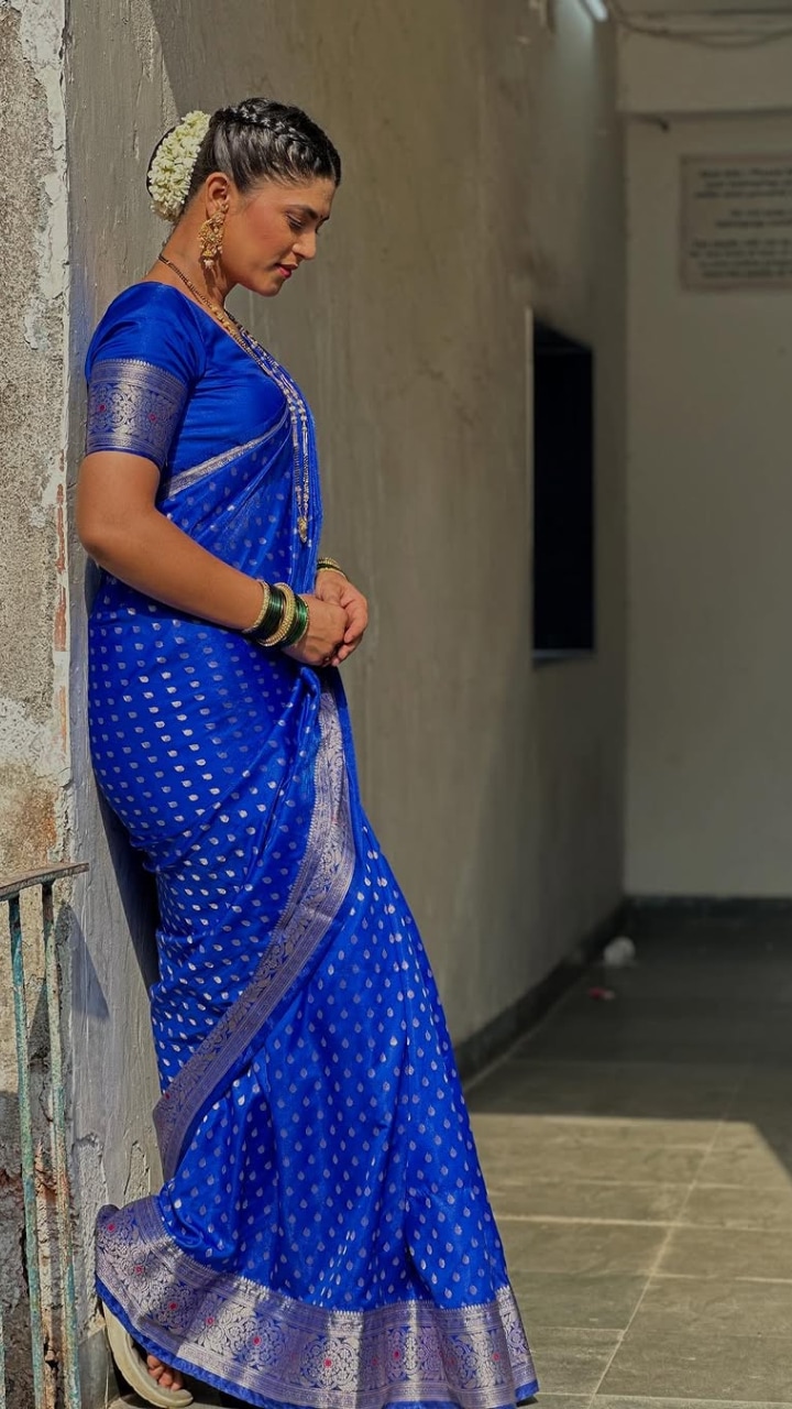 निळ्या रंगाच्या बनारसी साडीतील लूक
