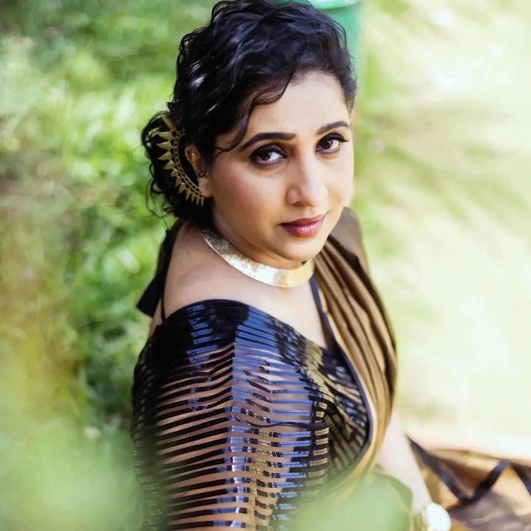 कॉपर कलर साडी त्यावर काळ्या रंगाचं डिझायनर ब्लाऊज