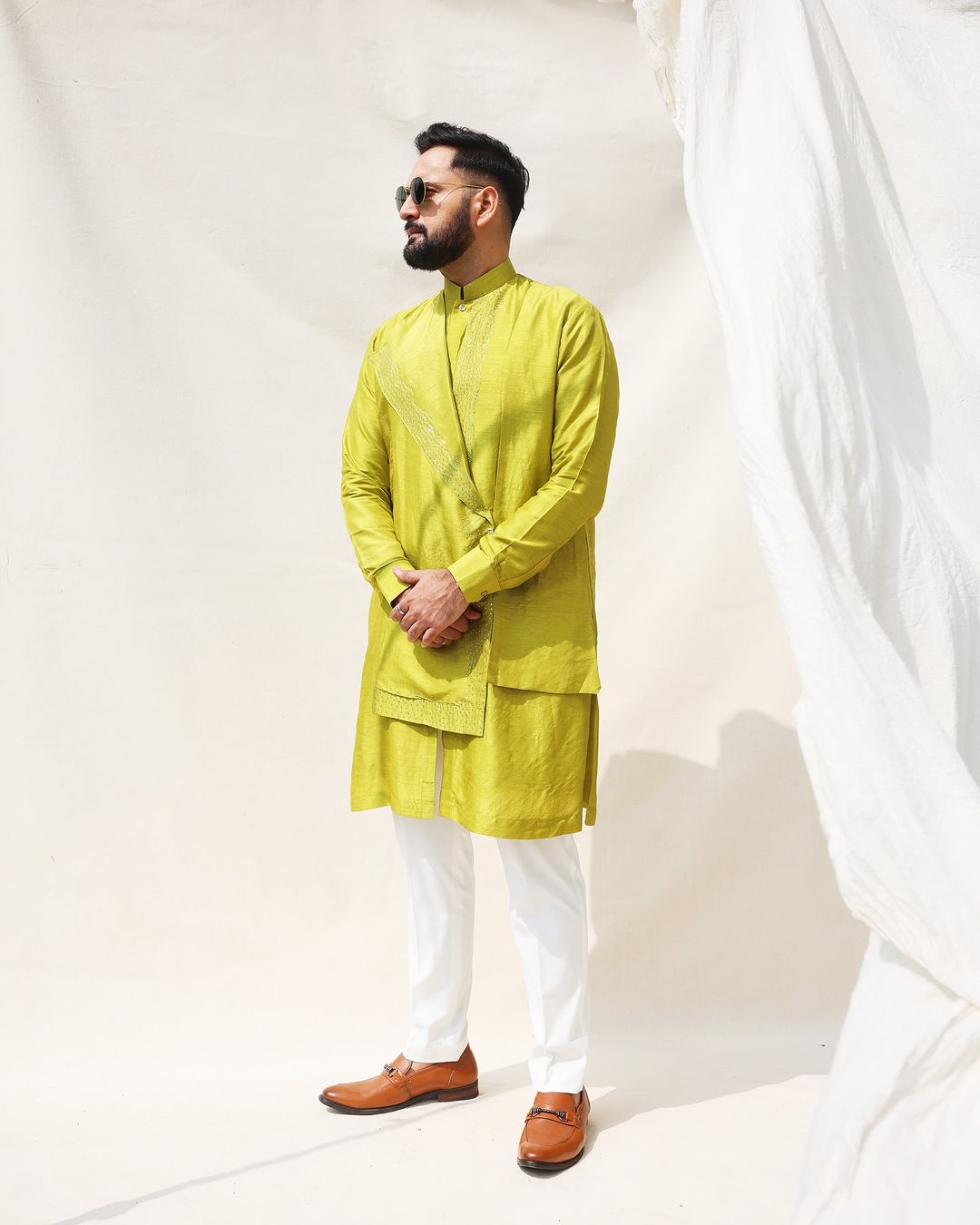 पोपटी रंगाचा डिझायनर कुर्ता आणि पायजमा परिधान