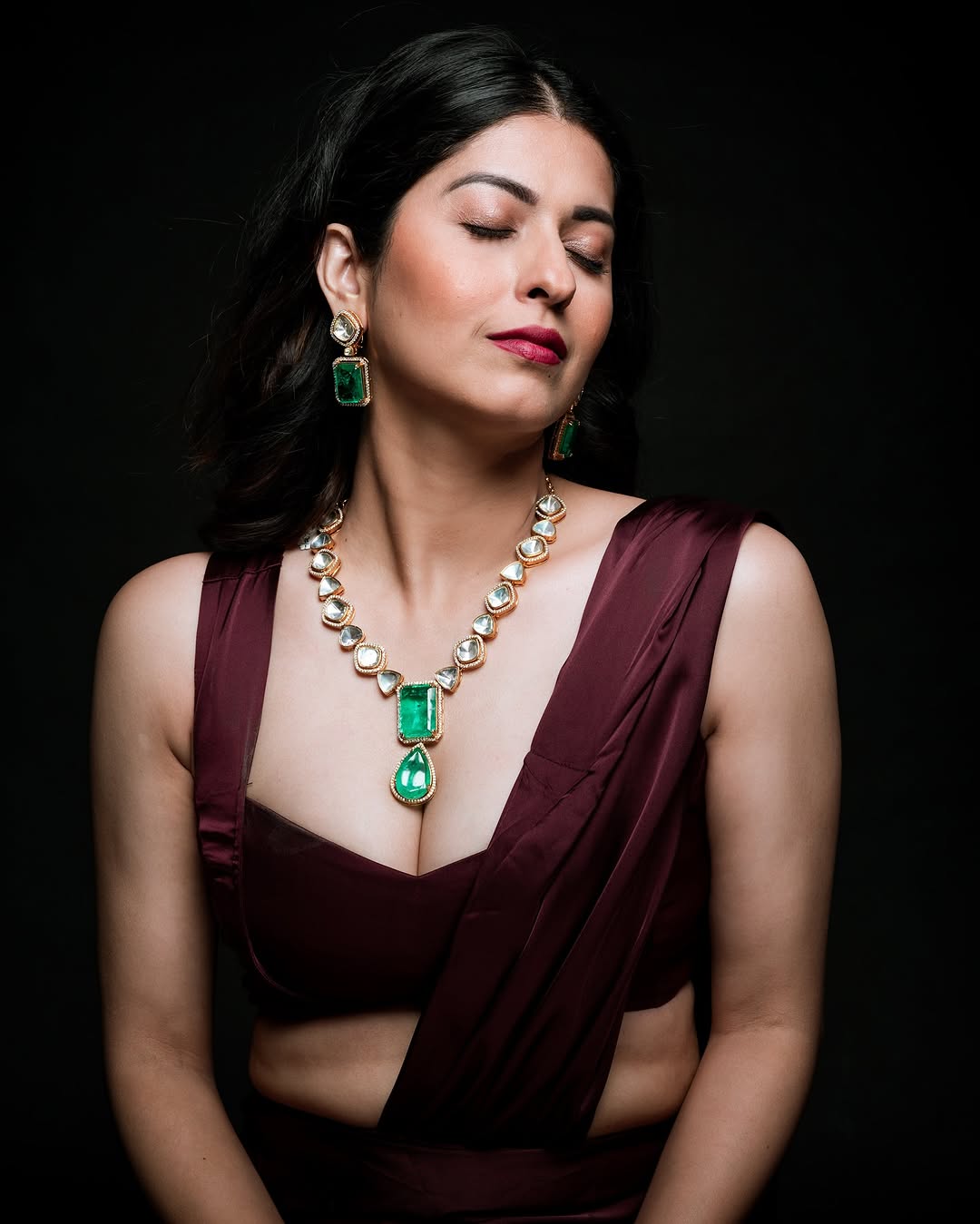 तपकिरी रंगाच्या सॅटिन साडीतील खास लूक