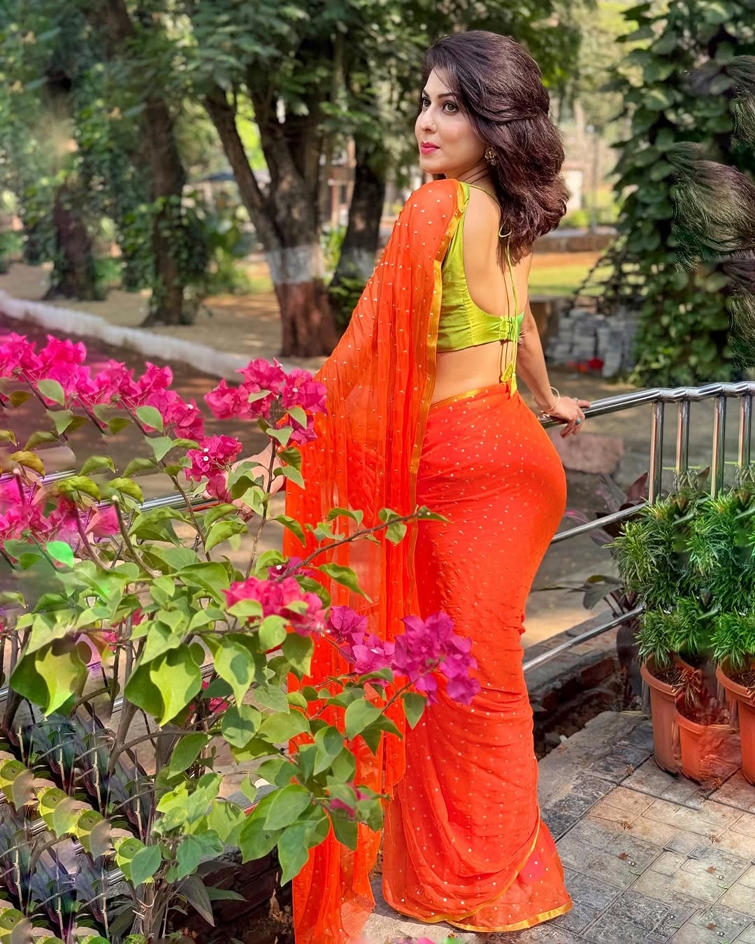 फोटोशूटसाठी नेसली भगव्या रंगाची डिझायनर साडी