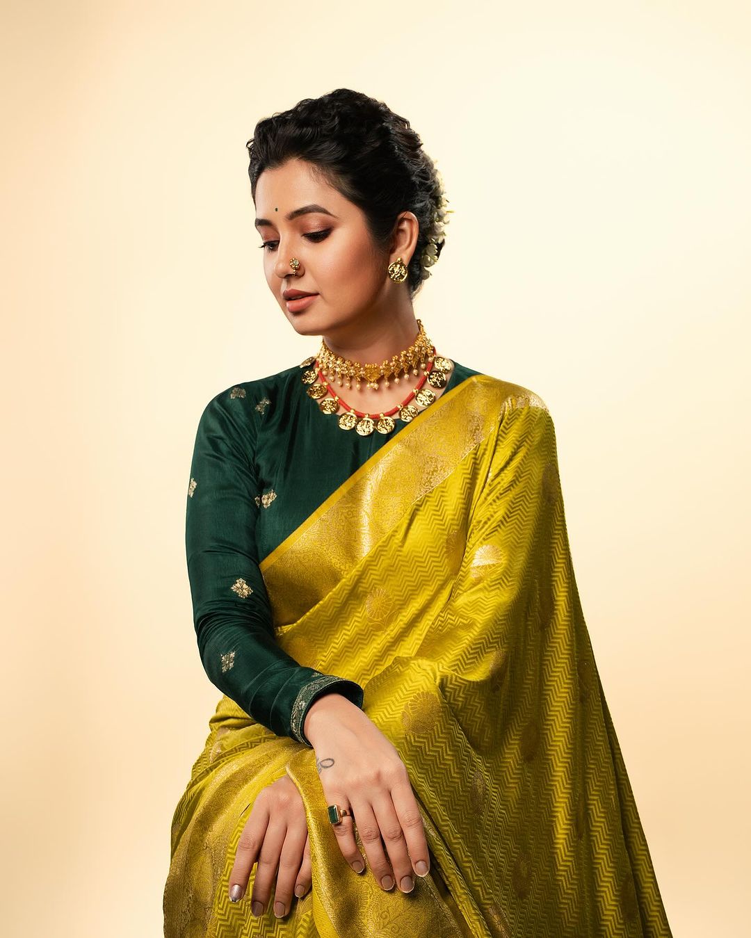 हिरव्या रंगाच्या बनारसी साडीत केले फोटोशूट