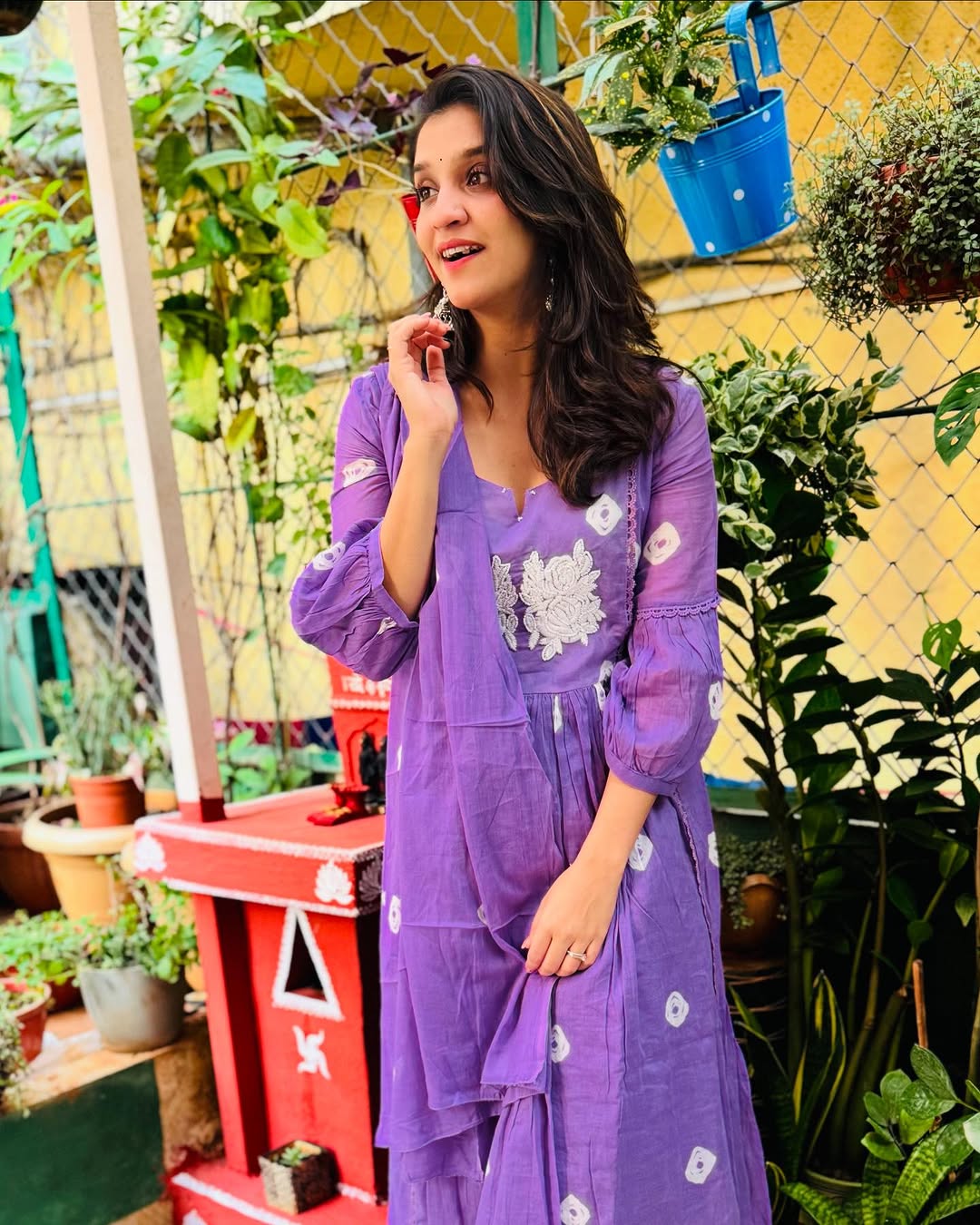 जांभळ्या रंगाच्या ड्रेसमधील खास लूक