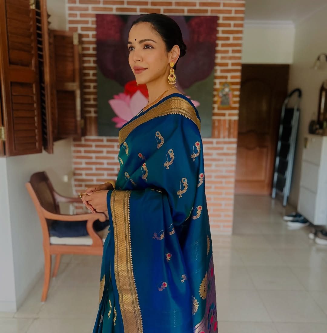 निळ्या रंगाच्या नथ पैठणी साडीतील खास लूक