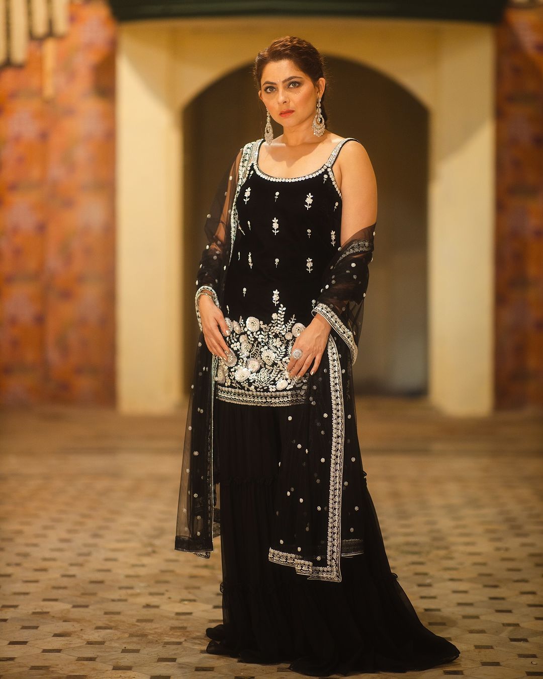 काळ्या रंगाचा डिझायनर ड्रेस परिधान