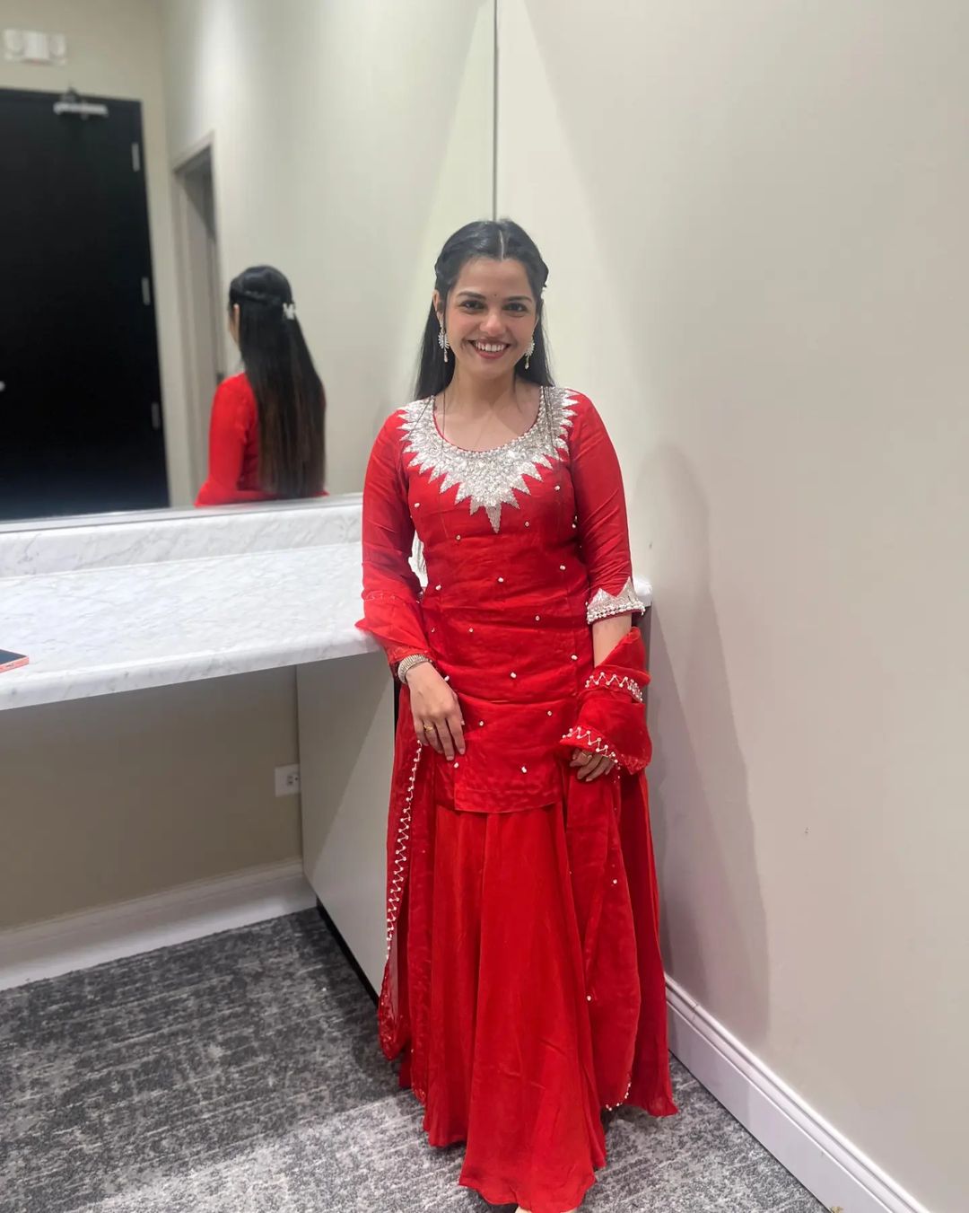 कार्यक्रमासाठी लाल रंगाचा शरारा ड्रेस परिधान