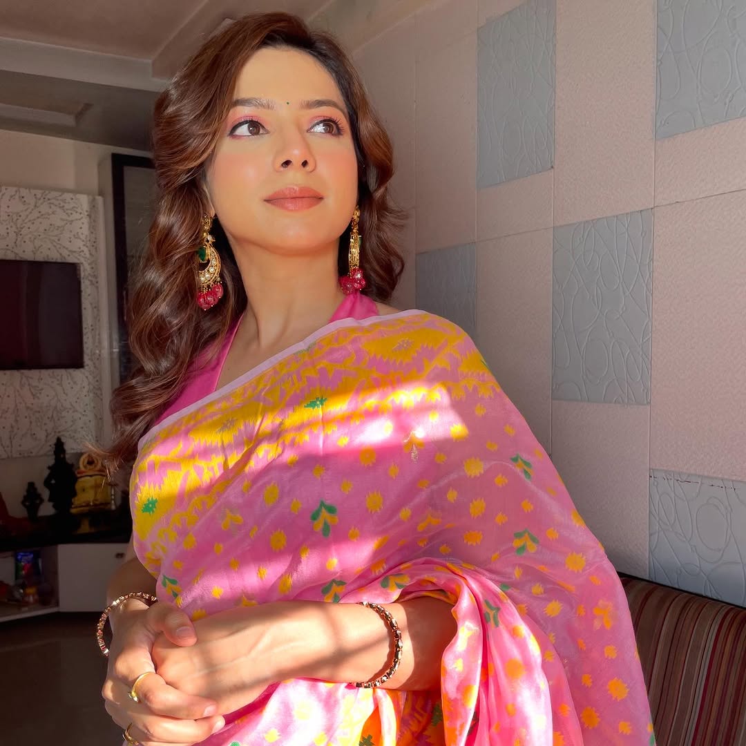 साडीतील लूकवर परिधान केला गुलाबी रंगाचा कॉन्ट्रास्ट ब्लाऊज