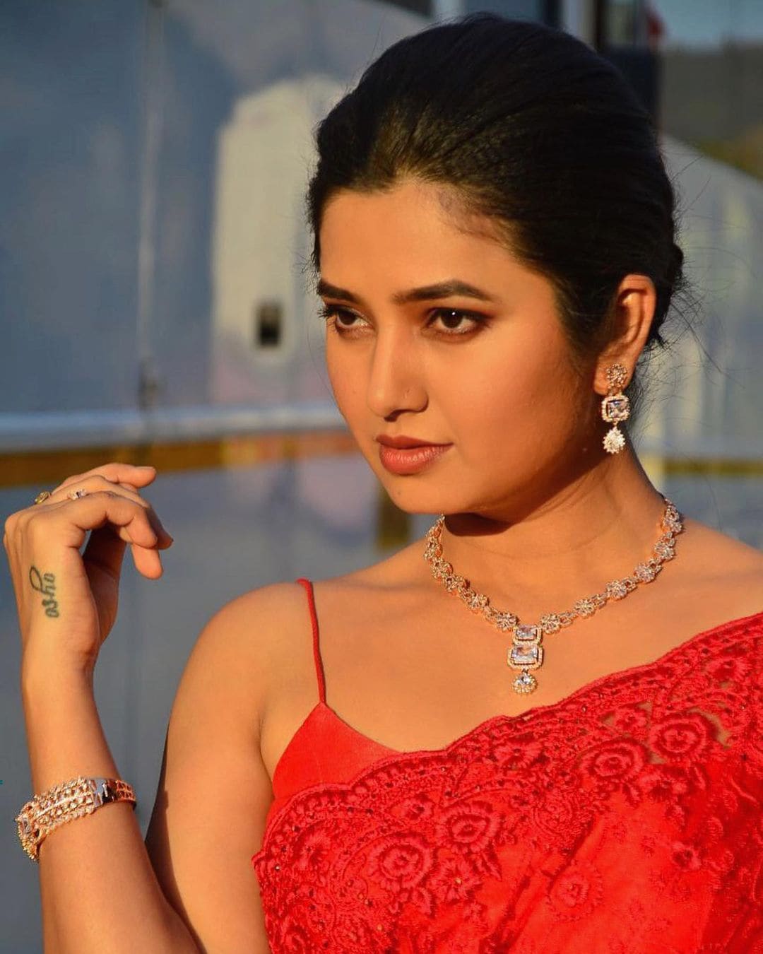 लाल रंगाची नेटची साडी आणि त्यावर बॅकलेस ब्लाऊज