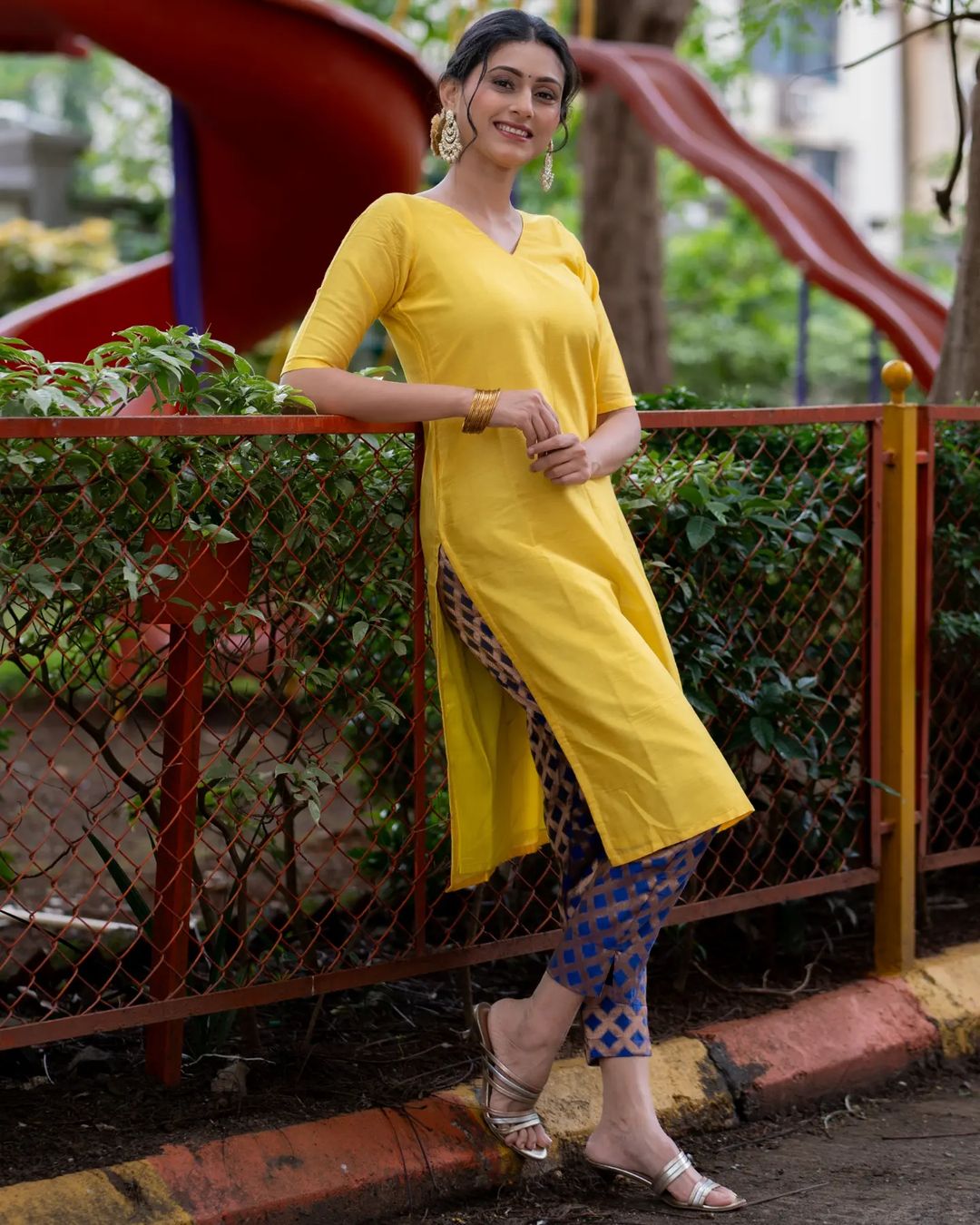 पिवळ्या रंगाचा कुर्ता आणि निळ्या रंगाची ब्रोकेड पॅण्ट परिधान