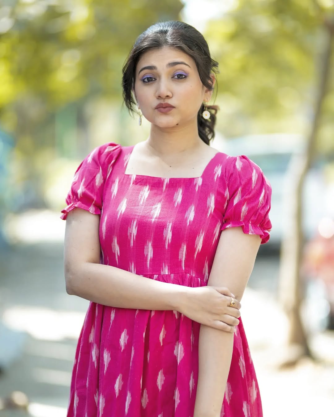 पांढऱ्या रंगाचा प्रिंटेड वन पिस ड्रेस परिधान