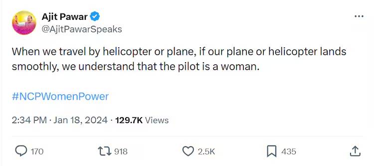 अजित पवारांच्या विमान अपघातानंतर त्यांचं एक जुनं ट्वीट व्हायरल होतंय. त्यात त्यांनी म्हटलंय की “जर विमानाचं लँडींग सॉफ्ट होत असेल तर त्यात महिला पायलट आहे असं समजून जावं.” इतका विश्वास अजित पवारांचा महिला पायलट यांच्याबाबतीत होता.