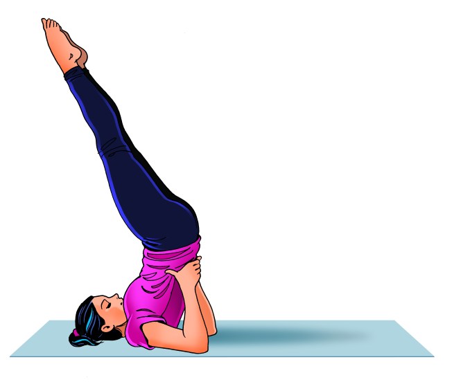 आता पृष्ठभाग जमिनीपासून वर उचला दोन्ही हातांचा पाठीमागे आधार द्या. सीट उचलताना न जमल्यास रोलिंग करून हे साध्य करण्याचा प्रयत्न करा. सावकाश पाय डोक्याच्या दिशेने न्या. आता पोटाचे स्नायू घट्ट करून पाय सरळ उभे करा. या स्थितीत पावले, पाय, सीट यांचा मान व डोक्याशी नव्वद अंशांचा कोन होईल.
