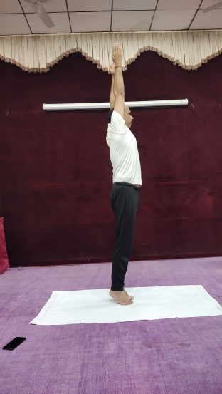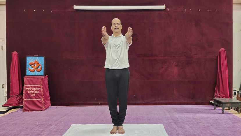 हात शरीराच्या बाजूला घ्या. आता एक श्वास सोडून द्या. एक दीर्घ व खोलवर श्वास घेत दोन्ही हात डोक्याच्या दिशेने वर घ्या. अलगद दोन्ही पायांच्या बोटांवर शरीराचा तोल सांभाळण्याचा प्रयत्न करा. कठीण वाटल्यास दोन्ही पायांत अंतर घ्या.