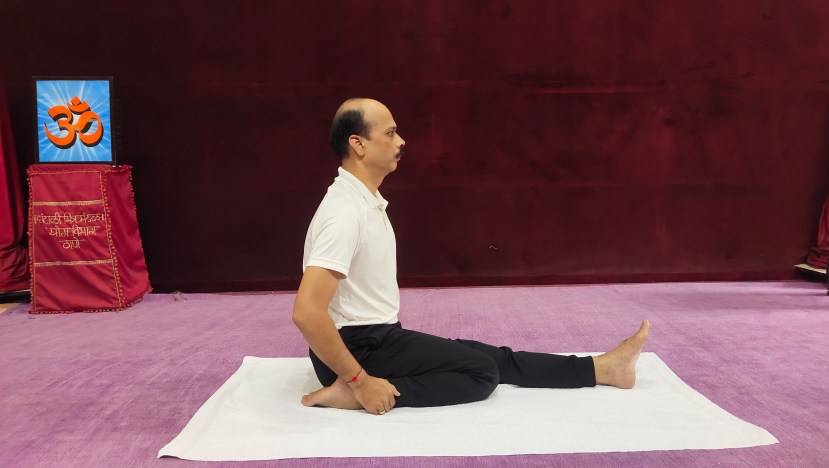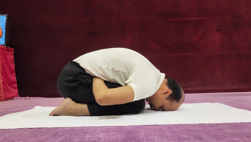 ओटीपोट, छाती, खांदे पुढे आणावे. कपाळ जमिनीवर लावावे. कुठल्याही क्षणी श्वास रोखून धरू नये. नियमित श्वसन चालू ठेवा. अंतिम स्थितीत श्वासावर लक्ष म्हणजेच प्राणधारणा करा. साधारण तीन ते पाच श्वास या स्थितीत थांबून उलट चाल करा.